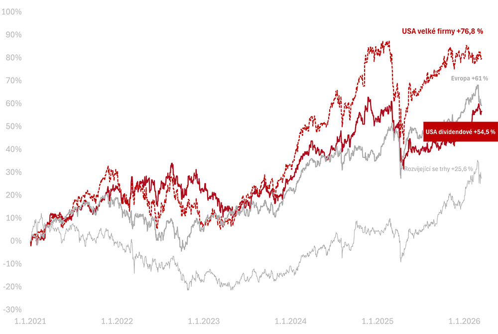 Od začátku roku 2026 jsou americké akcie velkých firem −1,6 % a americké dividendové +7,5 % v CZK.