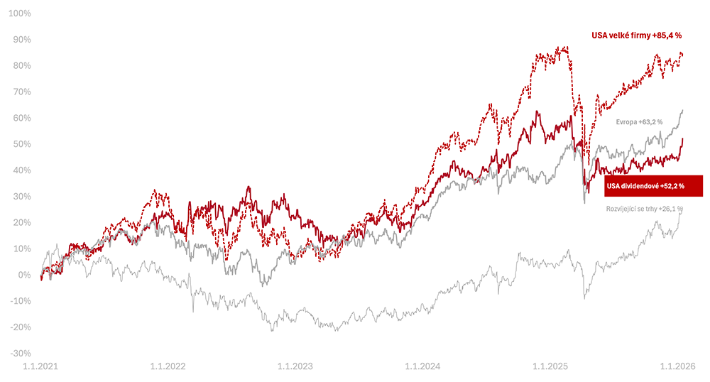 Za 5 let, od začátku roku 2021, vydělaly americké akcie velkých firem +85,4 %, americké dividendové +52,2 % v CZK.