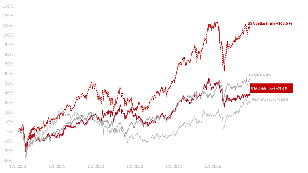 Od začátku roku 2025 jsou tak americké akcie v CZK −0,7 %. Americké dividendové ztratily −5 % v CZK.