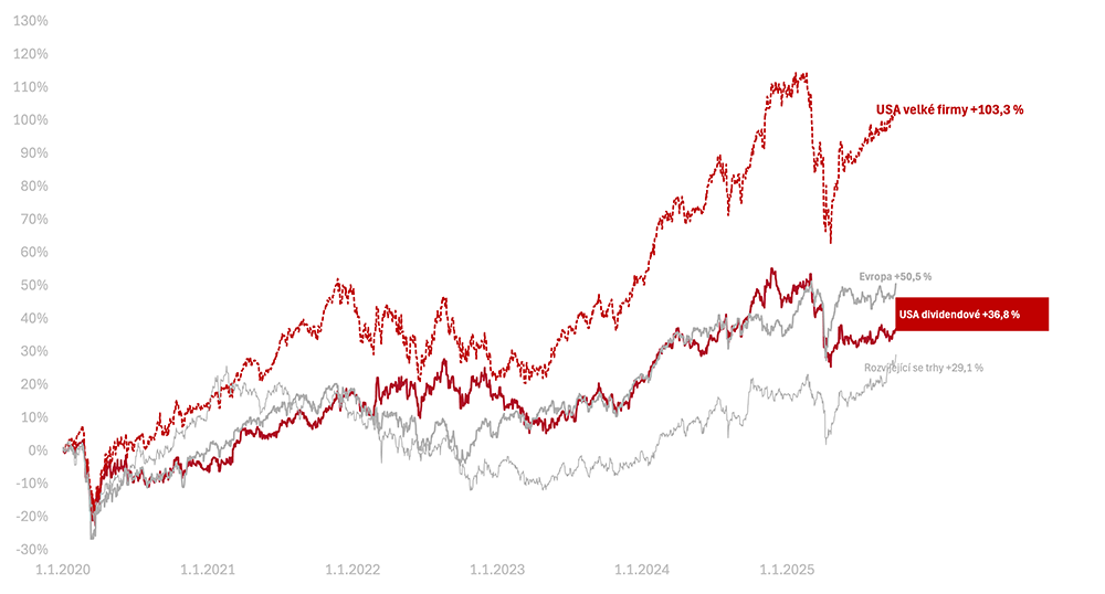 Od začátku roku 2022, kdy byly akcie na vrcholu před posledním významným propadem, jsou americké akcie velkých firem +38 % a americké dividendové +16,6 %.