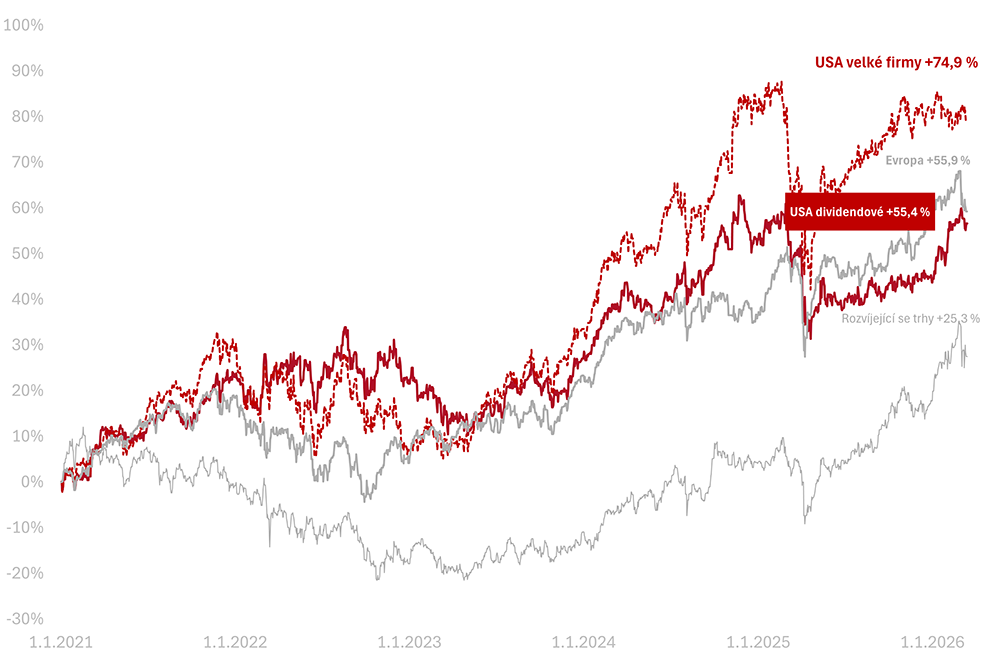 Od začátku roku 2026 jsou americké akcie −2,7 %, dividendové +8,1 %.