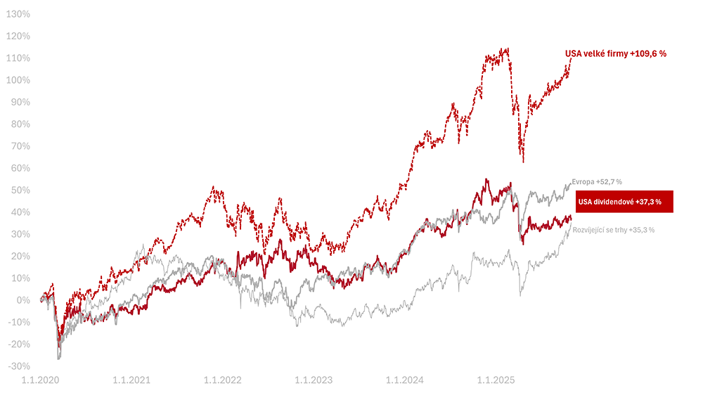 Od začátku roku 2025 je tak na amerických akciích mírný růst o +1,2 %. Americké dividendové zůstávají −5,9 % v CZK.