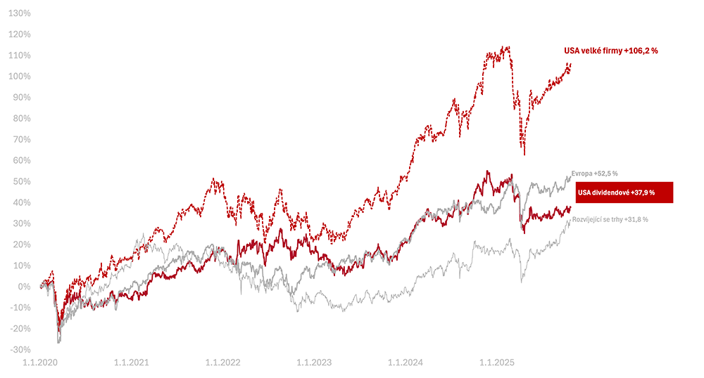Od začátku roku 2022, kdy byly akcie na vrcholu před posledním významným propadem, jsou americké akcie velkých firem +39,9 % a americké dividendové +17,5 %.